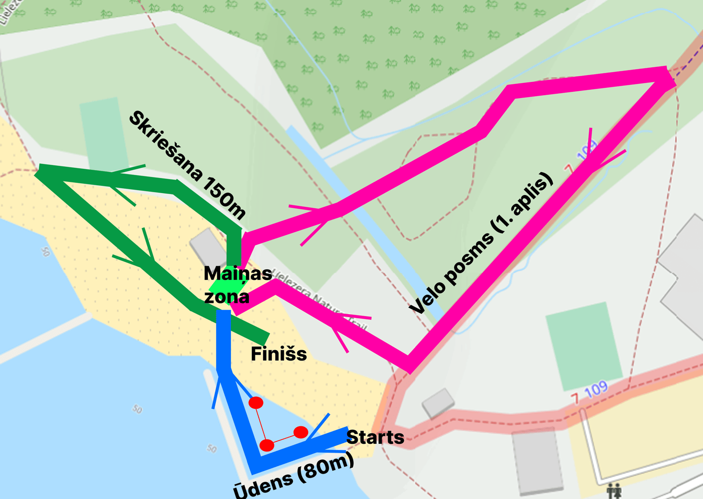 Riteņbraukšanas posmā 5-6 gadu grupai jāveic 1 aplis bērnu trasē pie Lielezera pludmales. Distance ir īsa un pārredzama, lai vecāki varētu sekot līdzi bērnu gaitām.