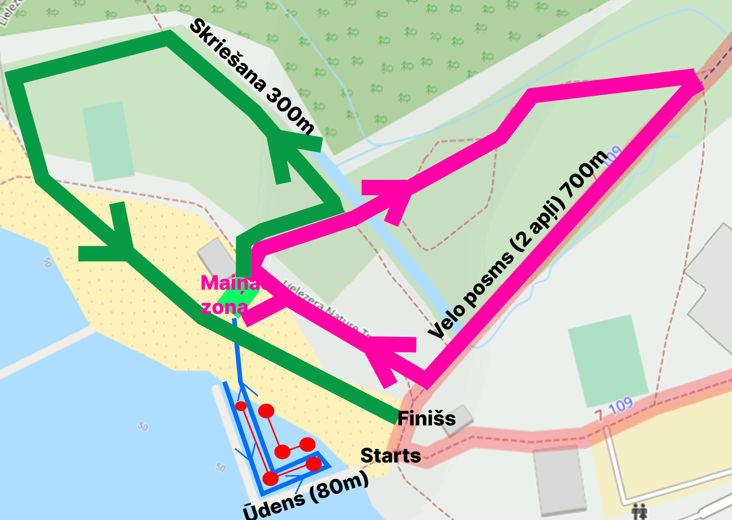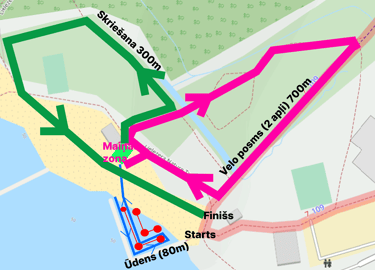 Riteņbraukšanas posmā 7-8 gadu grupai jāveic 2 apļi bērnu trasē pie Lielezera pludmales. Distance ir pārredzama, lai vecāki varētu sekot līdzi bērnu gaitām.